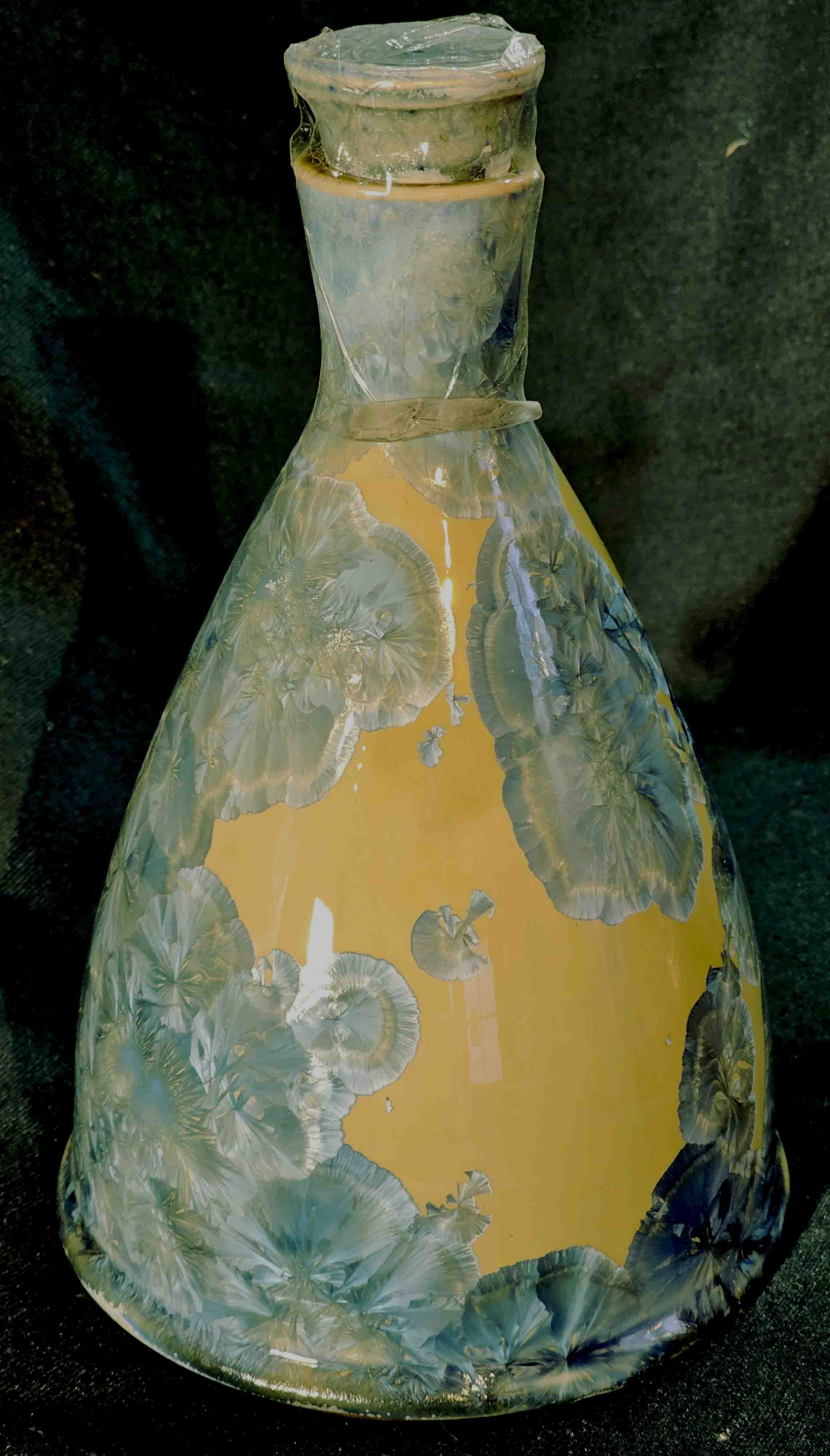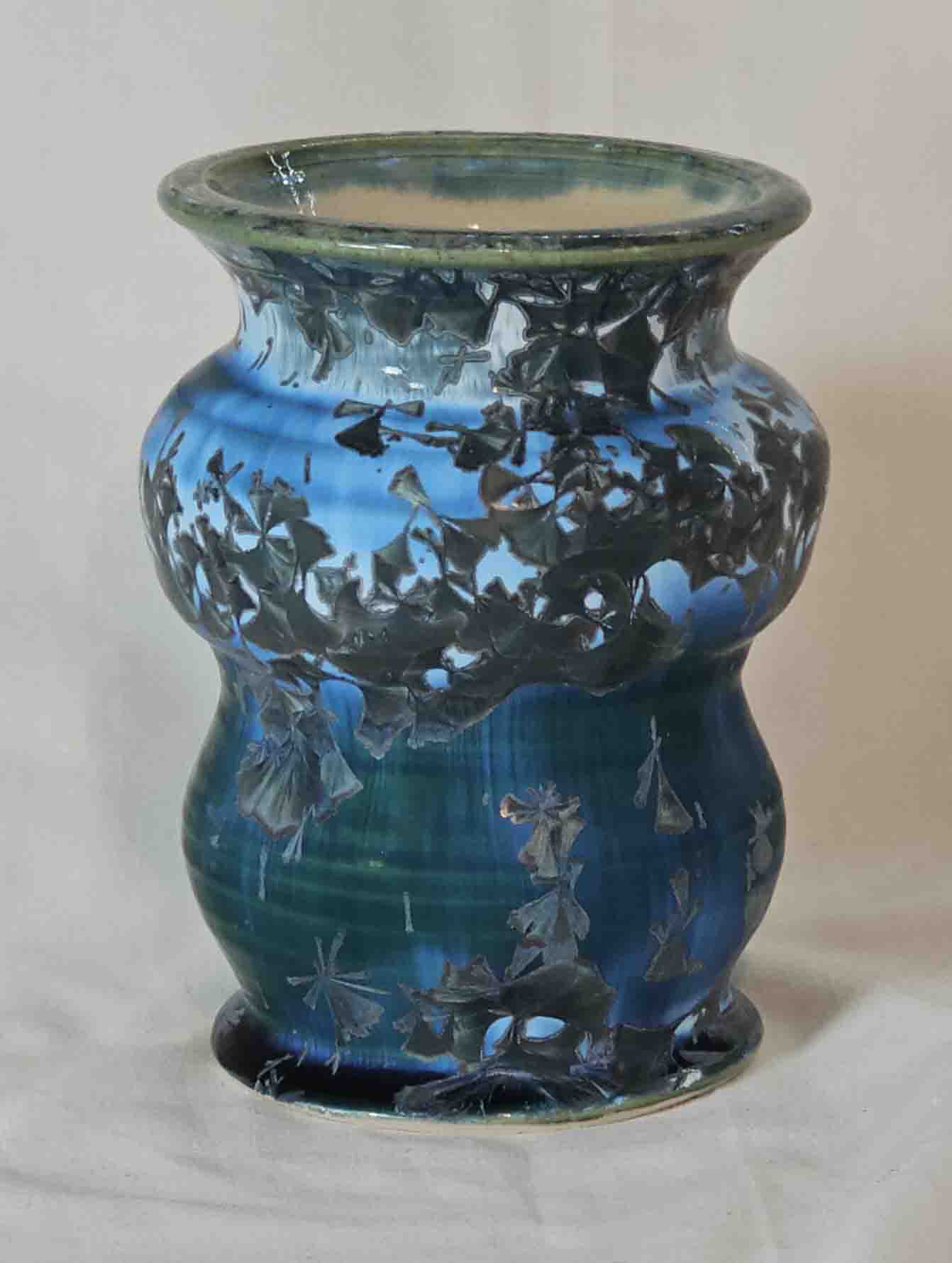 Blue & Yellow Crystal Glaze contains nickel as a colourant, producing both the blue crystals and the yellow background. The glaze is gloss, though slightly undulant over the crystals, which can be felt as well as seen. Once again, most interiors are clear glazed