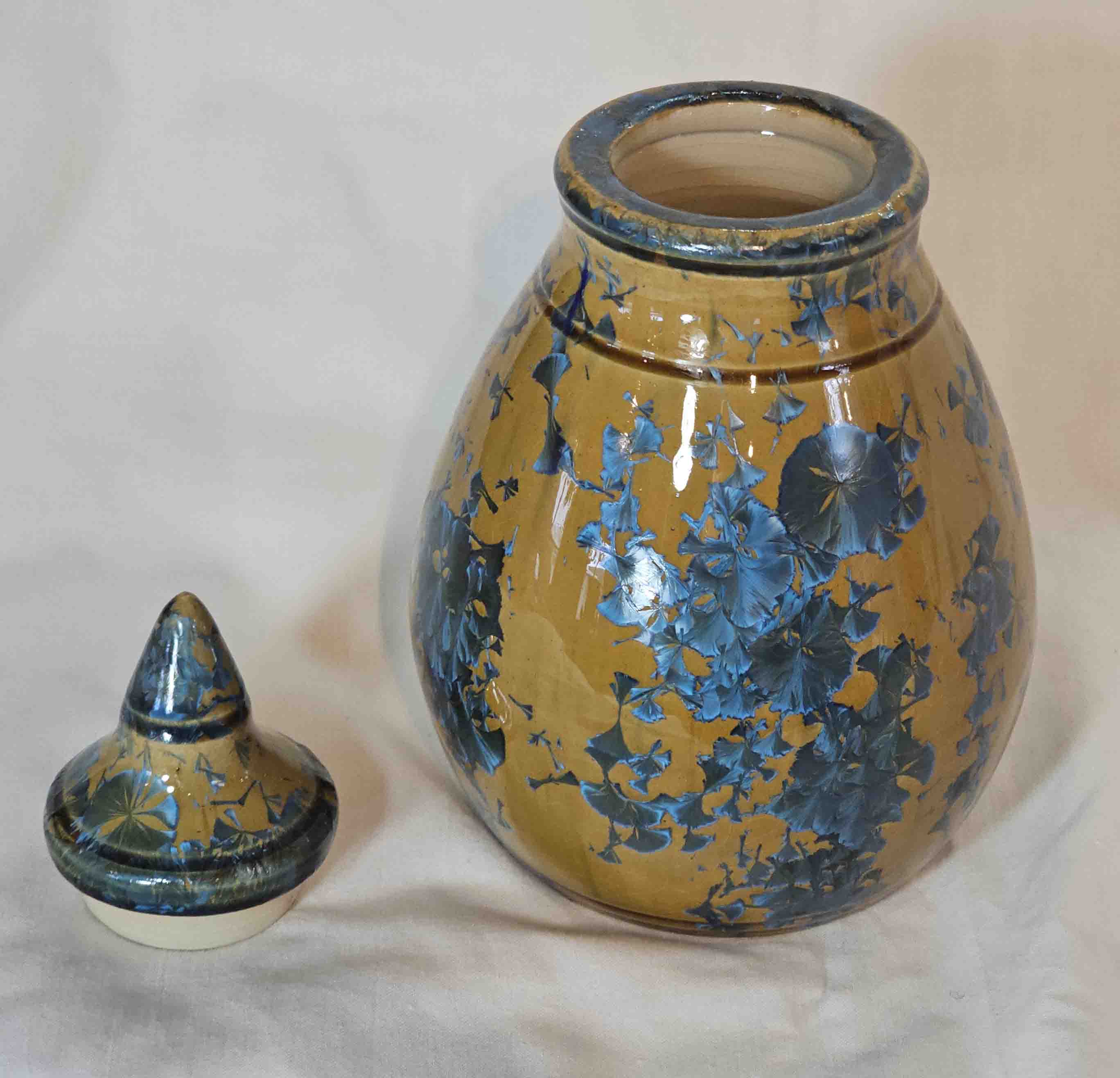Lidded stoneware Jar blue & yellow crystal glaze Ht 22cm